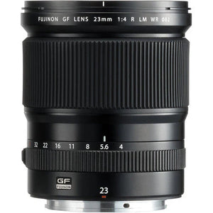 The GF 23mm f/4 R LM WR from FUJIFILM is an ultra-wide 18mm-equivalent prime designed for the G-mount GFX camera system. Ideally suited for architecture and interior photography, the lens's design employs a pair of aspherical elements to control distortion and spherical aberrations for accurate rendering, and a series of low dispersion elements are also featured for improved color accuracy and clarity. Balancing the optical attributes, the lens also utilizes a linear AF motor with an internal focusing design for quick and quiet focusing performance, and a manual aperture ring also avails intuitive exposure adjustment and a Command position permits making camera-based aperture selections. The 15 elements in 12 groups of optical design incorporates a pair of aspherical elements to reduce spherical aberrations and distortions for cleaner, more realistic rendering and sharper image quality. A Nano GI coating has been applied to individual elements to suppress surface reflections, flare, and ghosting for improved contrast and color accuracy when working in strong lighting conditions. A linear AF motor is used for quick, quiet focusing performance and an internal focusing mechanism maintains the overall length of the lens during operation and also produces consistent optical performance throughout the focusing range. Dust- and weather-sealed physical construction enables working in harsh climates and temperatures as low as 14°F.
